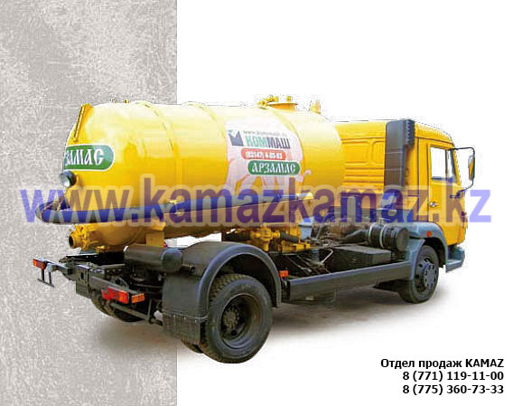 2 цистерны по 5 куб.м., с механизмом выдачи и укладка рукава, шасси: КАМАЗ-65115-773082-42, Евро-4, 6х4, двускатная ошиновка, г/п 14.65 тонн, мощность 280 л.с., КПП 154, монтажная длина рамы 5780 мм, шины 10.00R20 11.00R22,5, бак 350 л., ТСУ, МКБ, МОБ, дв. КАМАЗ 740.622-280 (Е-4), топл. ап. BOSCH, Common Rail, ДЗК, завод-производитель спецтехники: ООО "КОММАШ-ГРАЗ".